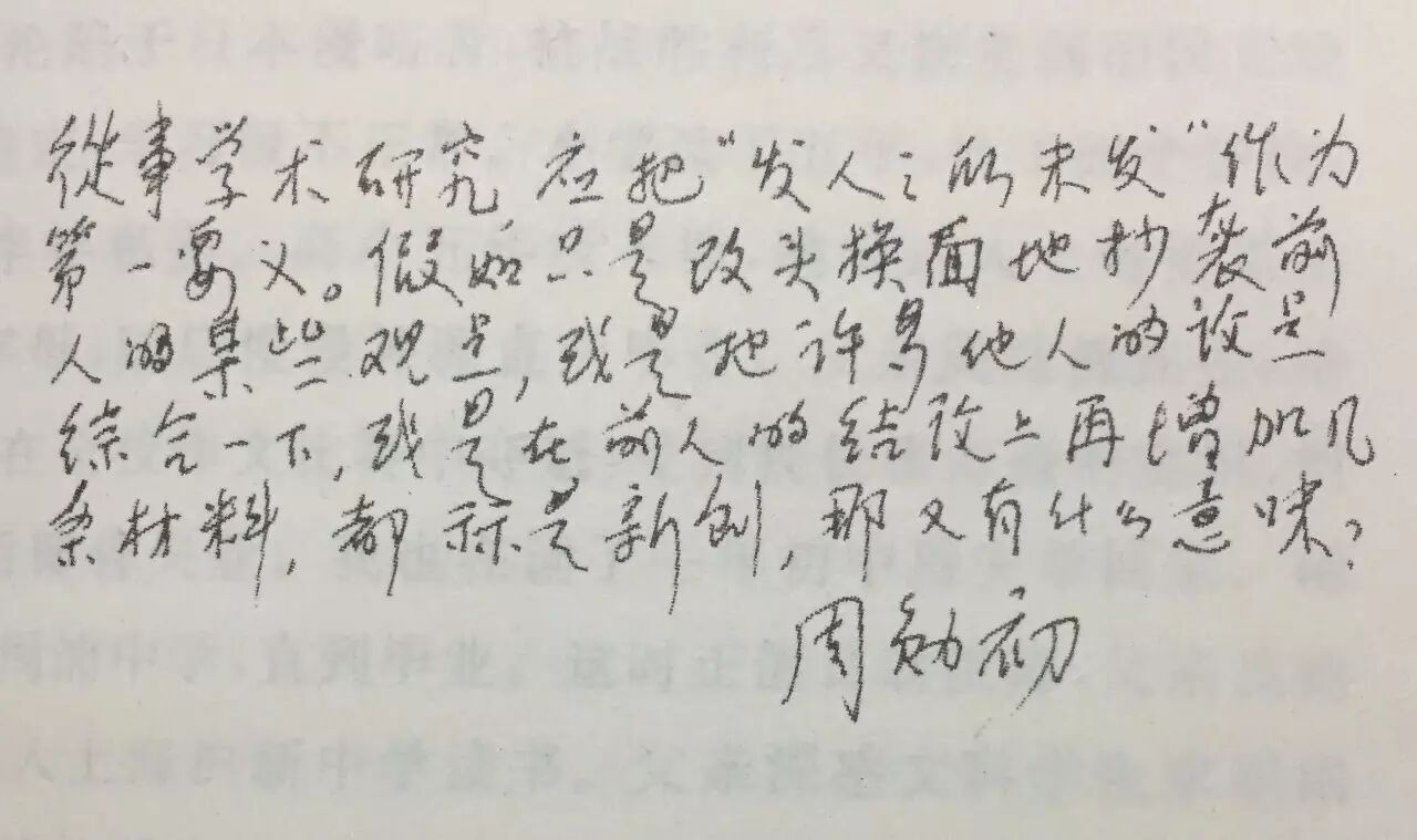 ▲周勋初先生语:“从事学术研究,应把‘发人之所未发’作为第一要义。假如只是改头换面地抄袭前人的某些观点,或是把许多他人的论点综合一下,或是在前人的结论上再增加几条材料,都算是新创,那又有什么意味?”